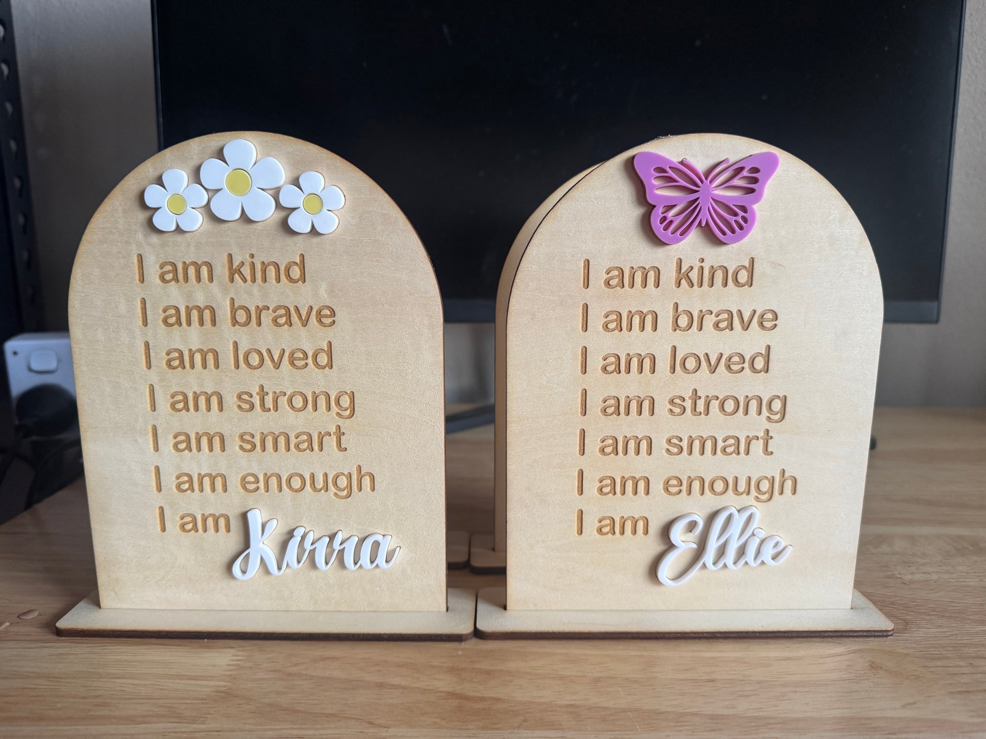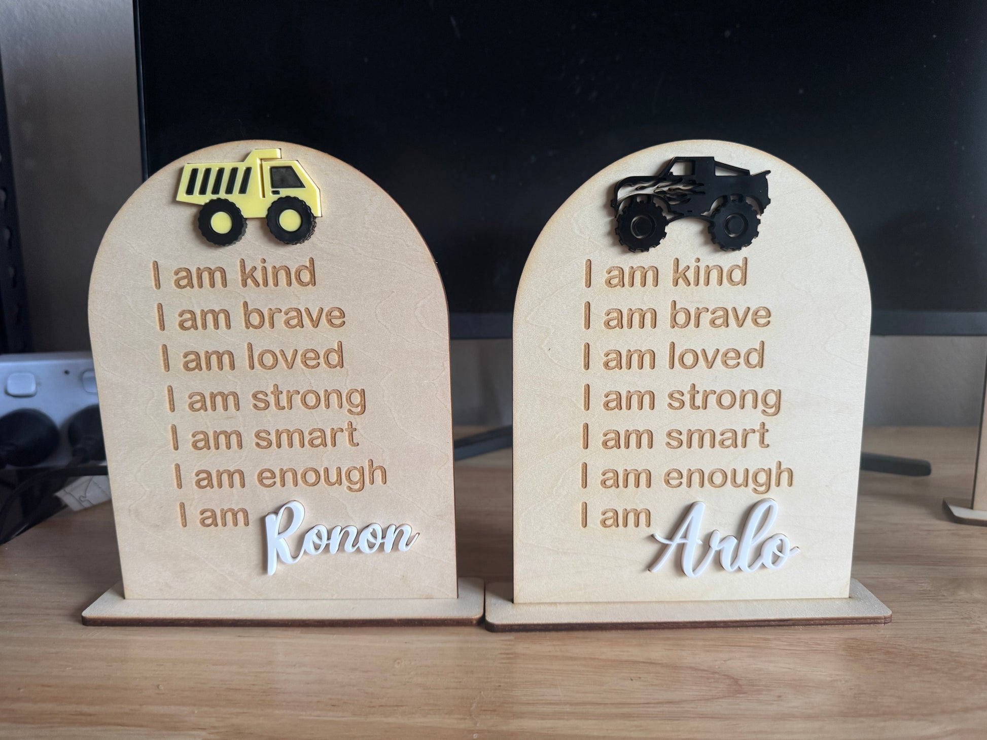 Confidence starts with the words we speak 💕 Our personalised wooden affirmation plaques remind little ones every day that they are kind, brave, loved, strong, smart, and enough. Each plaque comes with their name in raised acrylic and a fun topper to match their personality—choose from daisies, butterflies, a construction truck, or a monster car. A beautiful keepsake with an even more powerful message. ✨