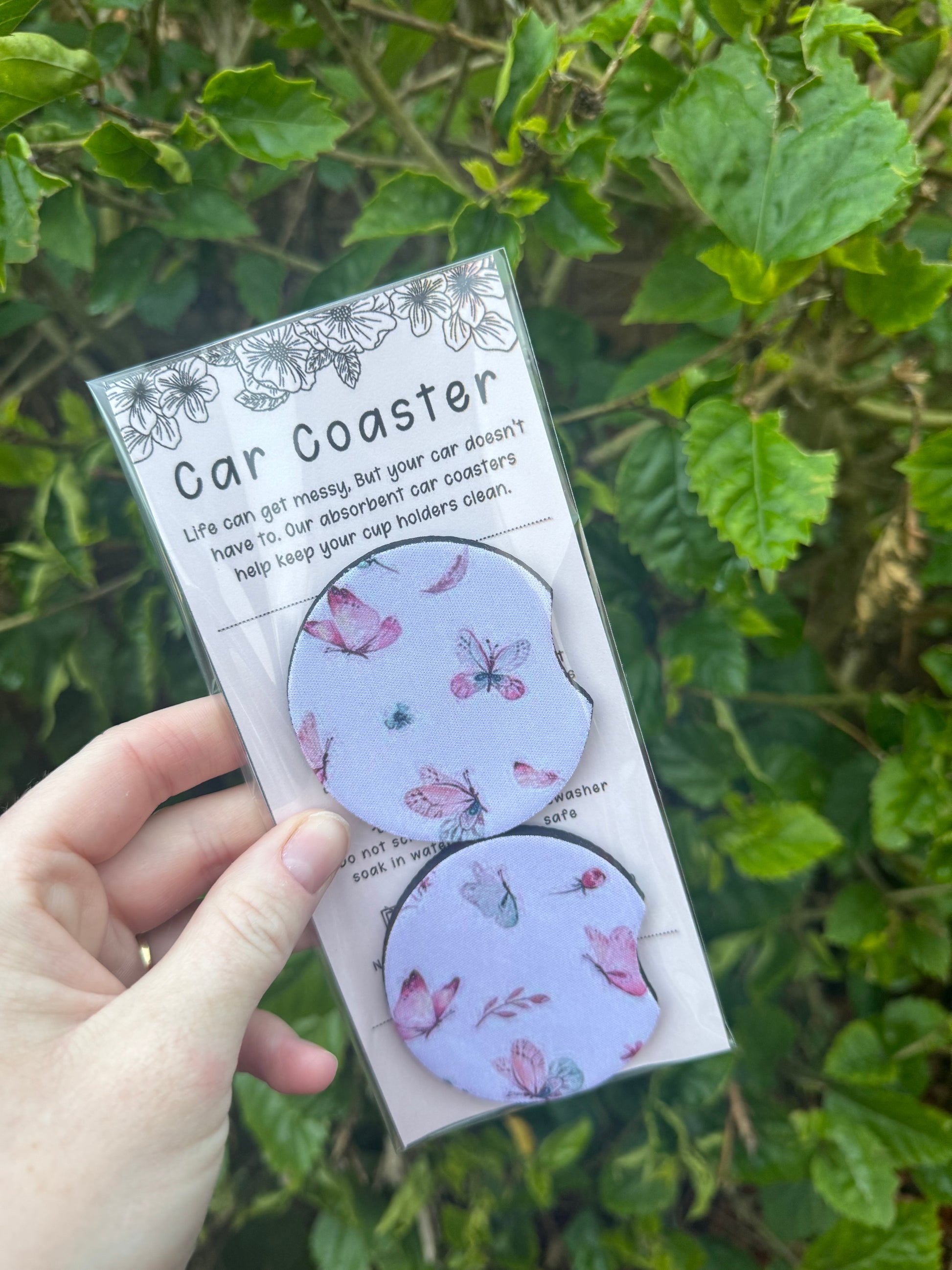 Car coasters are great! Absorbs moisture from condensation of your drinks so protects your car and look cute too!