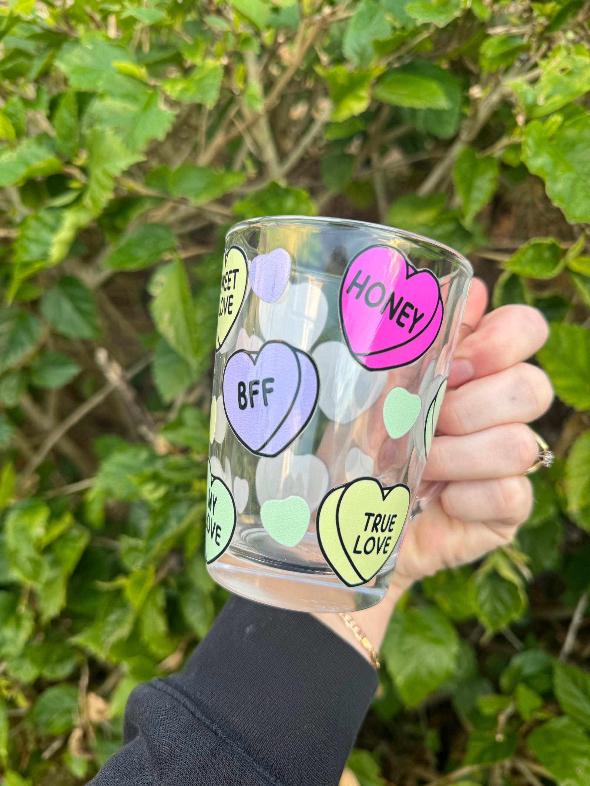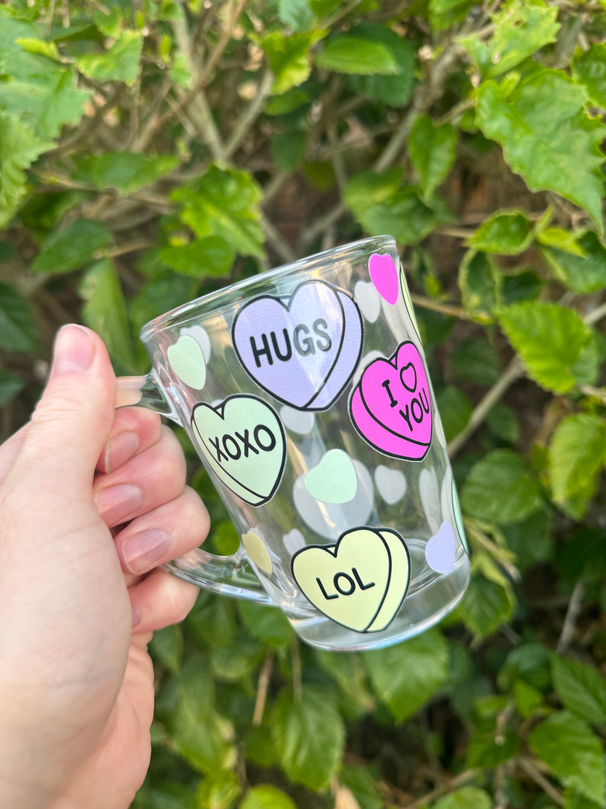 Candy hearts on a glass mug! These are suitable for hot or cold drinks!