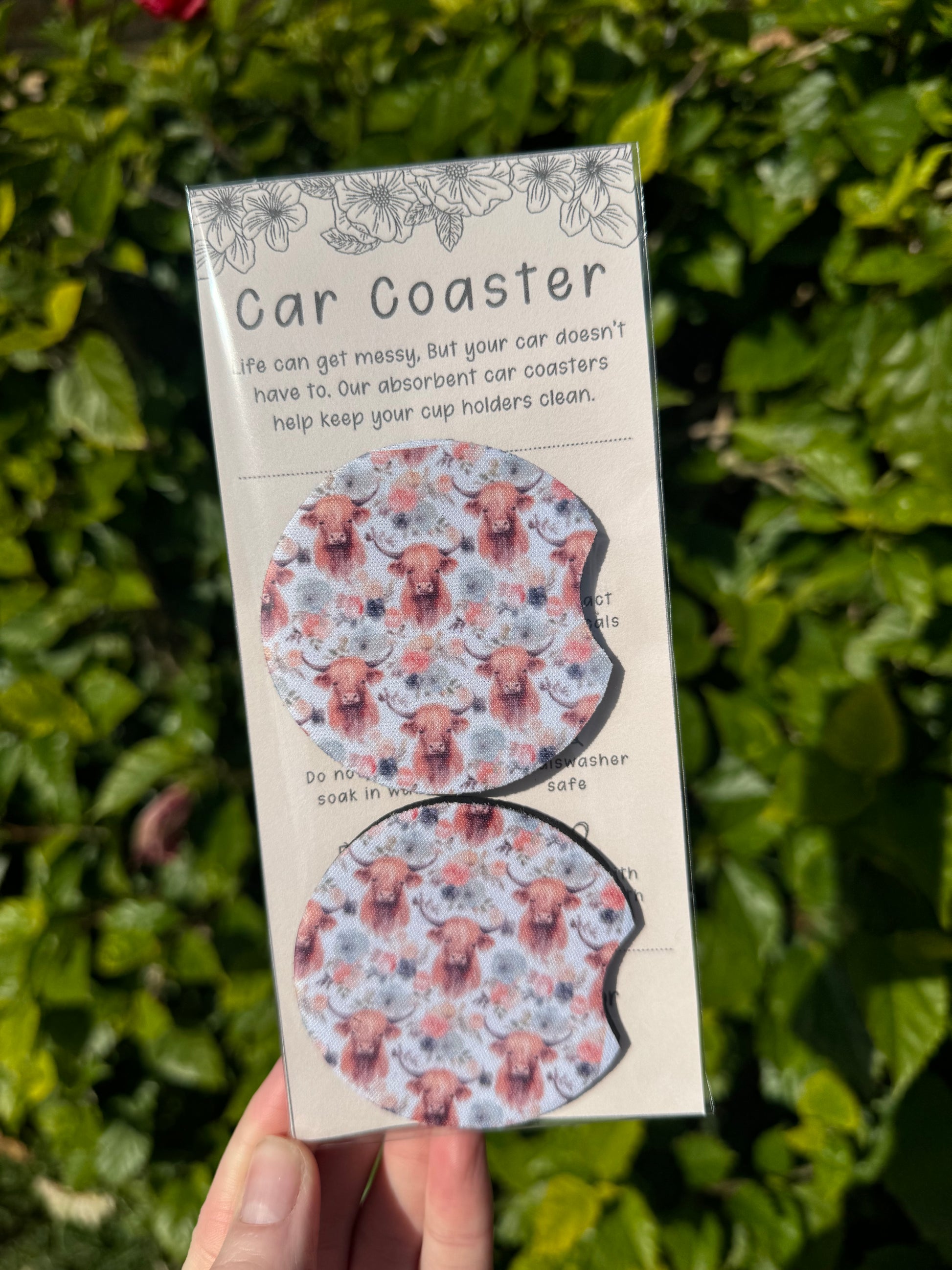 Car coasters are great! Absorbs moisture from condensation of your drinks so protects your car and look cute too!
